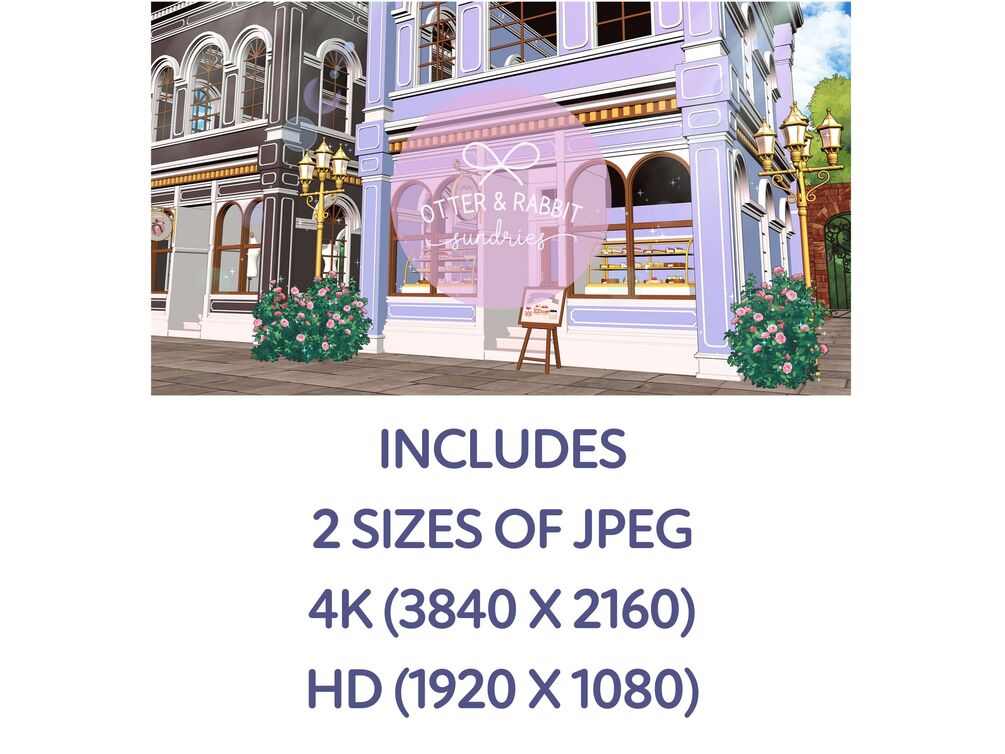 🖌️☕ Includes 4 versions of a pastry café in morning, midday, and sunset lighting. Art features a street scene with alternative versions that include a café table, chair, and 3 different types of table decorations- Tea & Pastry, Coffee & Cake, and Wine & Chocolates. Perfect for Vtubers with romantic, cute, or classy aesthetics!